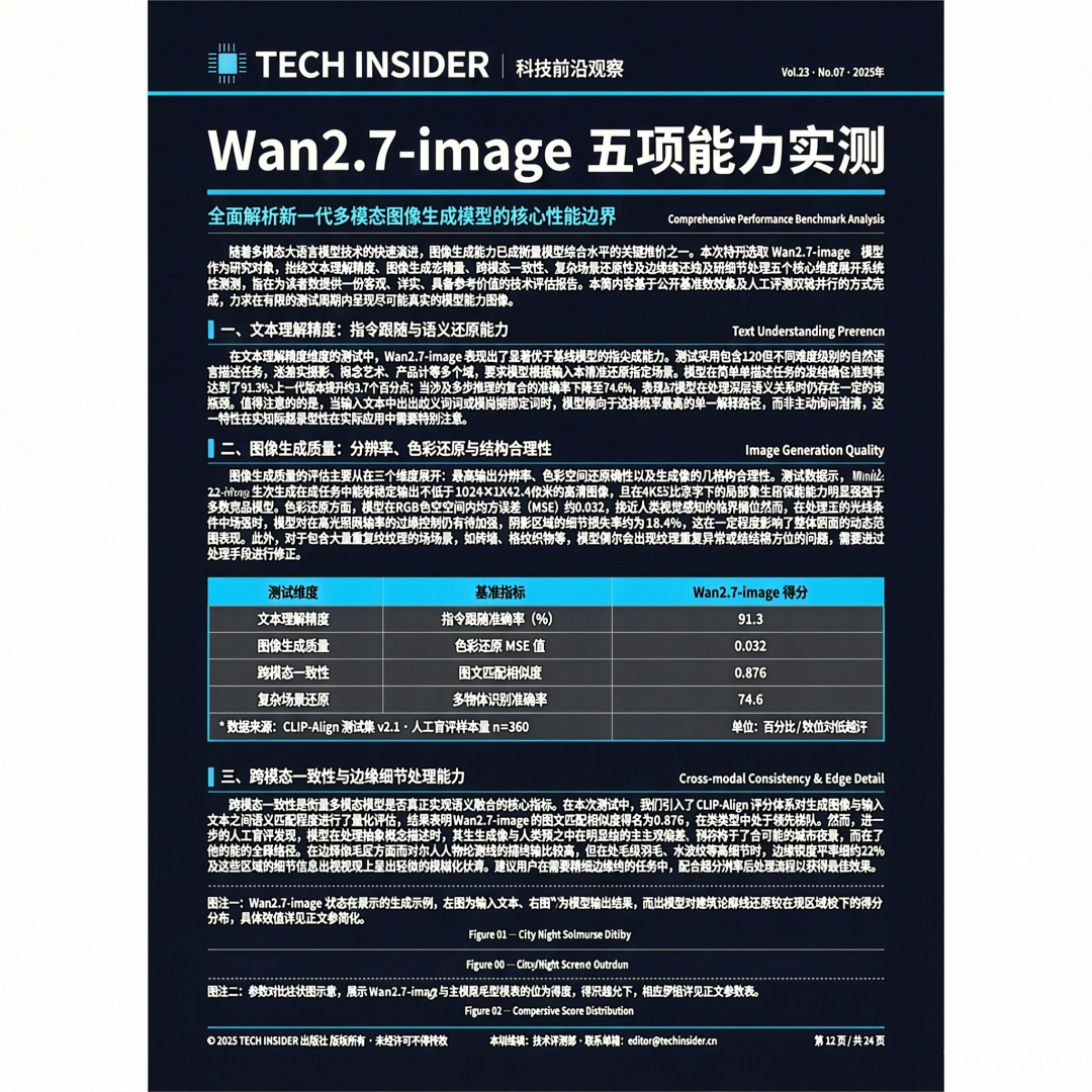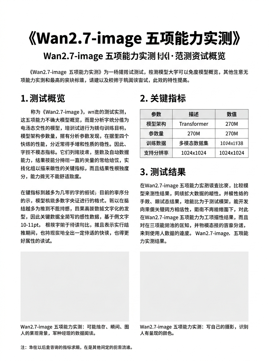 提示词:请生成一张 A4 竖版的中文科技媒体特刊内页,标题为《Wan2.7-image 五项能力实测》,包含:主标题、副标题、导语、3 个小标题、两段长正文、一个 4 行 3 列的参数表、两条图注、一个页脚备注。整体排版像正式杂志内页,中文字体清晰,字距行距合理,层级明确,整页内容充实但不拥挤,必须保证正文可读,不要出现乱码、缺字、错位或重复字。
