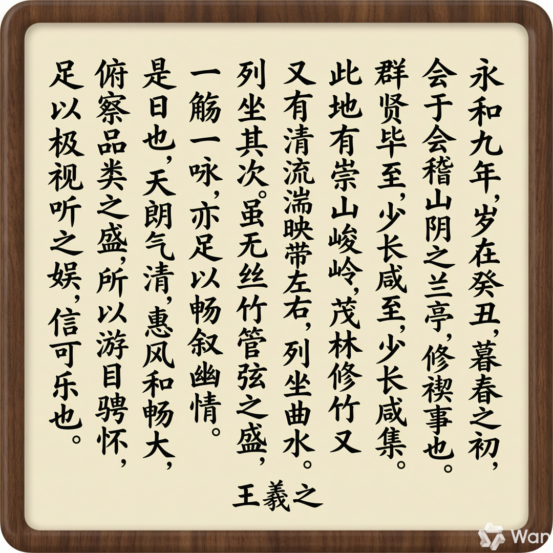 提示词:请生成一张王羲之《兰亭集序》的竖版书法卡片