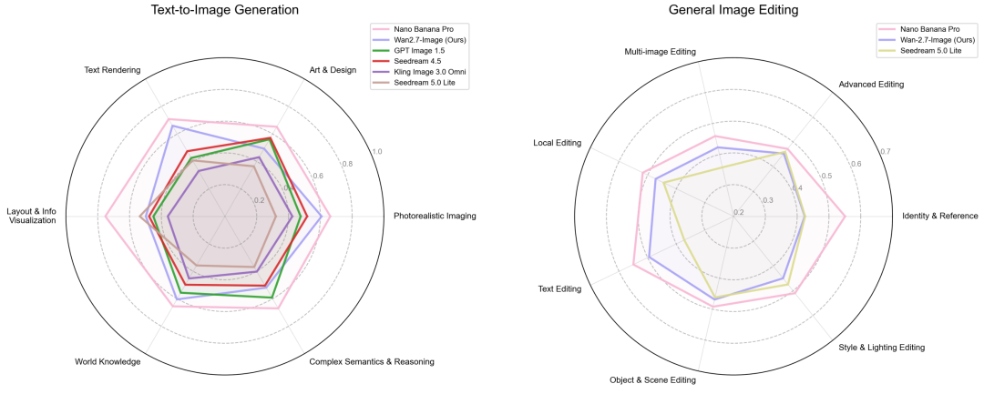 根据官方给出的评测数据,在人类偏好盲测中,Wan2.7-Image的文生图能力超过了GPT-Image 1.5和国内主流模型(包括Seedream 4.5、可灵Image 3.0 Omni、Seedream 5.0 Lite等),在文本渲染、照片级成像和世界知识三项指标上最接近Nano Banana Pro,可谓国内最强生图模型。在图像编辑维度,它与Nano Banana Pro和Seedream 5.0 Lite形成了三足鼎立的格局,在身份参考和风格光影编辑上表现突出。