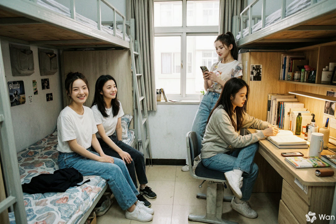 提示词:参考我上传的 4 张人物照片,生成一张“大学新生宿舍合影”场景:四个人坐在宿舍床边和书桌前,镜头为室内广角纪实摄影。要求四个人保留各自五官特征、发型、肤色和气质,不要串脸;服装与动作自然,画面有生活感,不要像电商摆拍。
