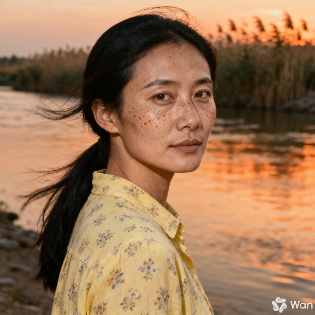 提示词:一位27岁中国西北少数民族女性,长方脸偏窄,下颌线清晰,轻微高颧骨,丹凤眼但眼神柔和,鼻梁挺直不过分夸张,嘴唇偏薄,皮肤有真实毛孔与轻微瑕疵,脸部留有自然雀斑,黑色长发扎低马尾,穿浅黄色碎花衬衫,站在傍晚河边的微风中回头看镜头。日系写真人像风格,35mm 镜头,电影胶片质感,柔和自然光,不要网红磨皮,不要夸张大眼,不要塑料皮肤,不要过度锐化。