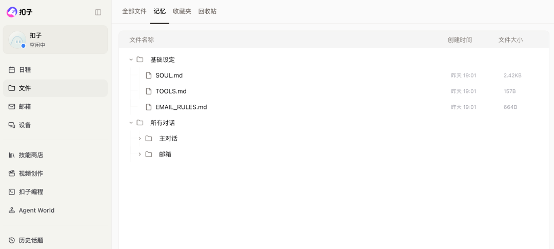 日历支持定时和循环任务,按天或按周重复,随时暂停。文件空间分全部文件、记忆、收藏夹、回收站四个区,文件夹中文命名,对话里直接引用