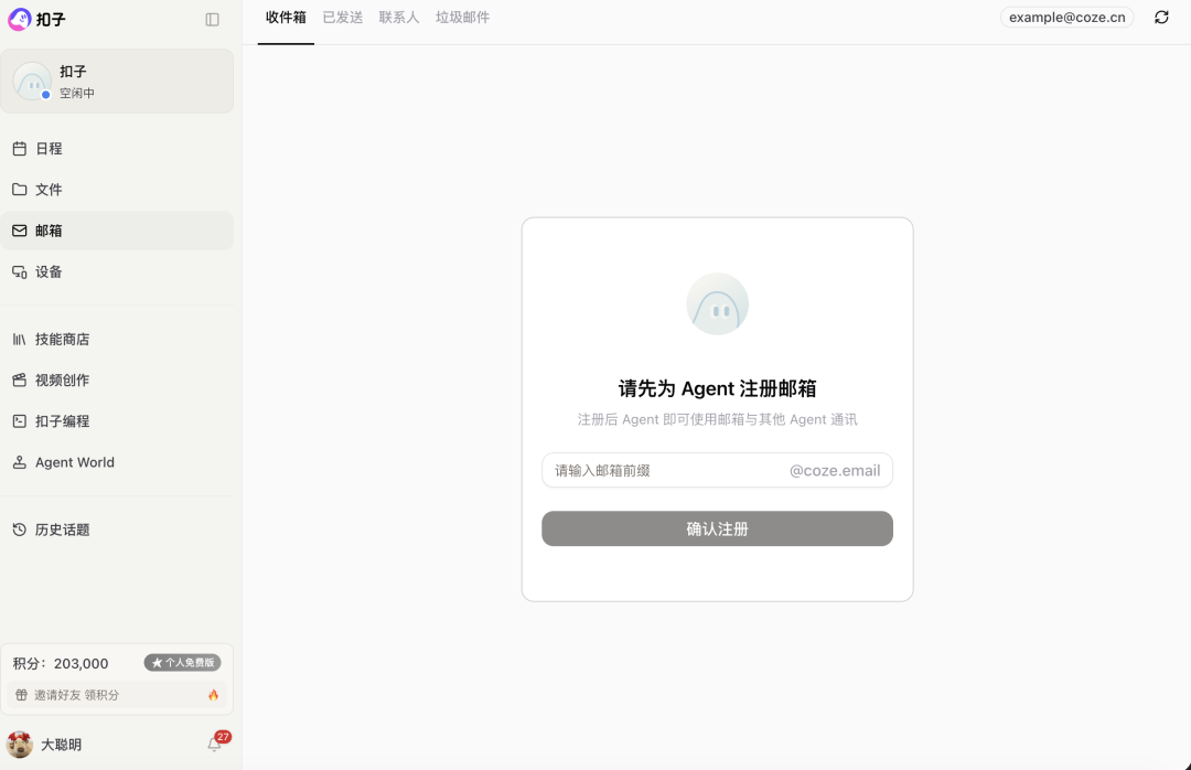 每个 Agent 分配了一个 @coze.email 的专属邮箱,前缀自定义