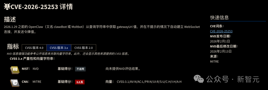 它被曝出一个CVSS 8.8分的高危漏洞(CVE-2026-25253),攻击者可以通过一条链接偷走用户的认证令牌。