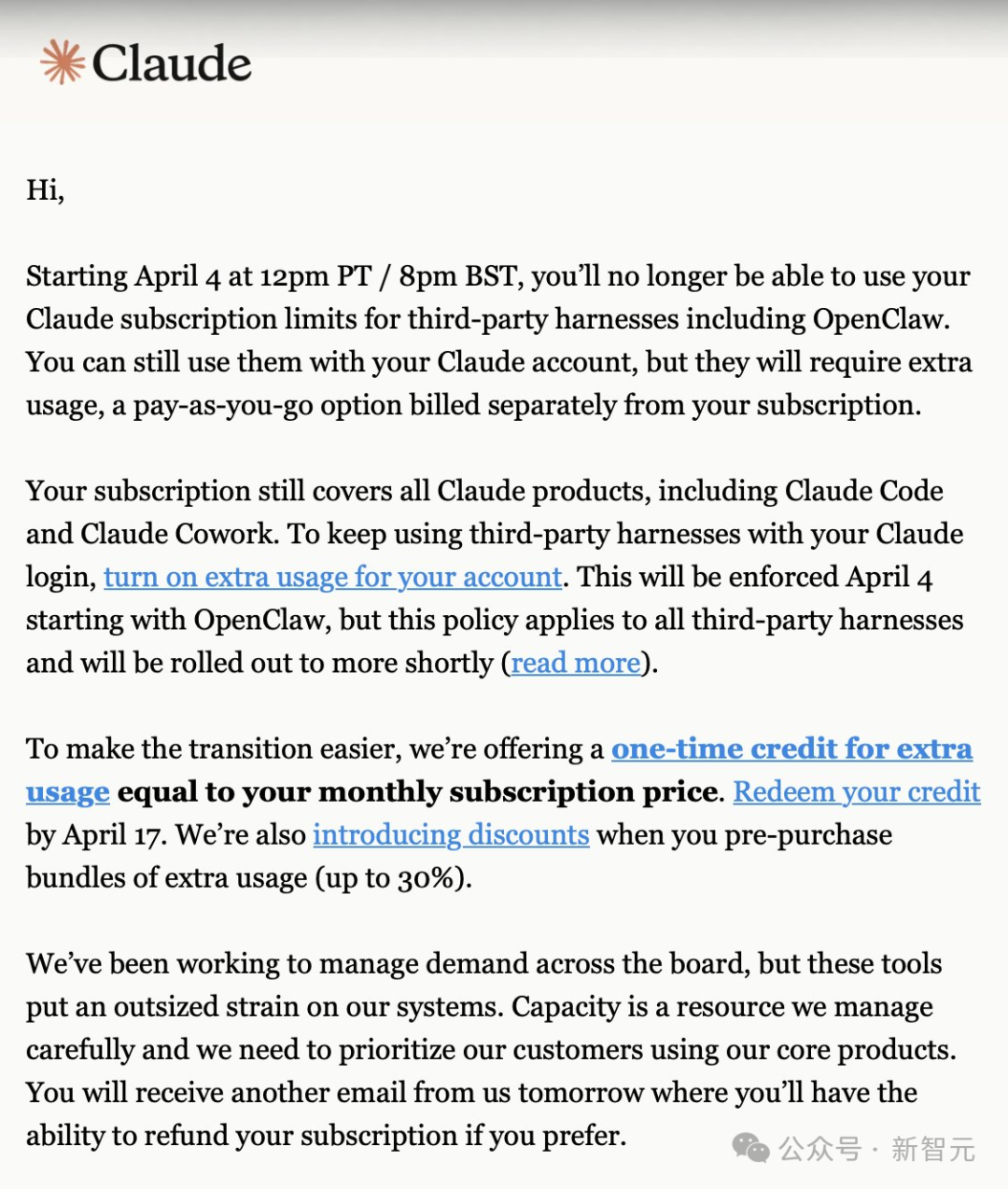 Anthropic给成千上万OpenClaw用户发出通知:明天起,你的Claude订阅额度不能再给OpenClaw用了,想继续,那就按量计费吧。