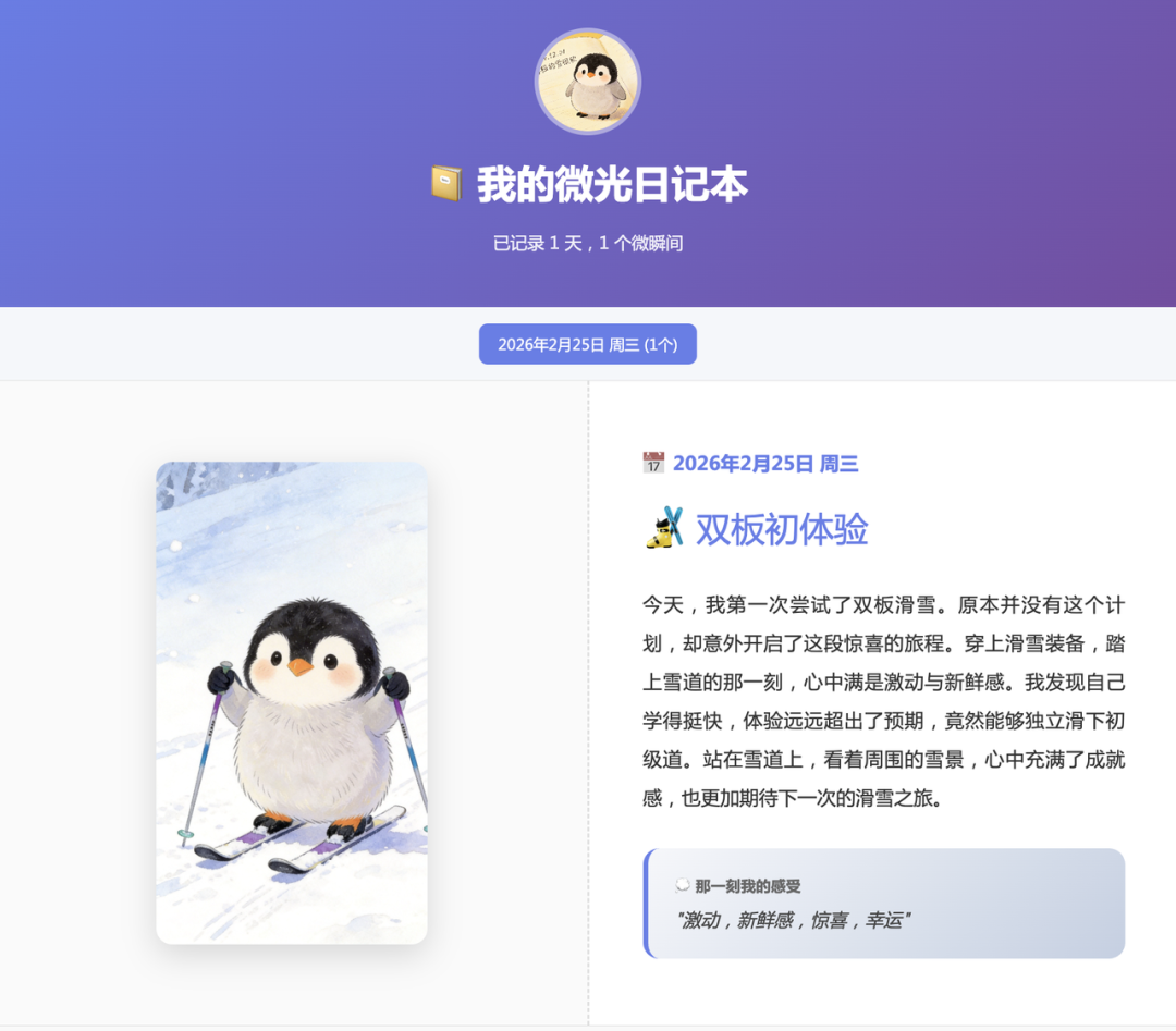 这是一个基于积极心理学的渐进引导式日记工具。AI 会根据你的回答自动评估你的「微瞬间觉察能力」。觉察力强的用户,它给开放式提问,快速记录就好;觉察力弱的用户,它从五感开始一步步引导,像朋友聊天一样帮你把那些被忽略的小幸福捞出来。最后生成一本插画故事书,可以翻页浏览,也能导出 PDF。