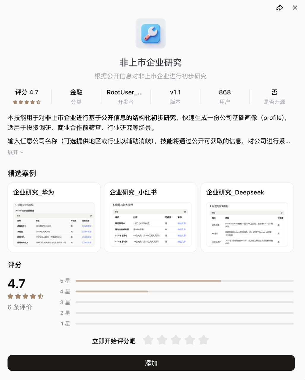 「非上市企业研究」切的是投资和商务调研场景。输入一个公司名称,Skill 自动通过公开信息生成一份结构化画像,包括基本信息、主营业务、业务模式拆解、经营指标、融资历程。业务模式拆解还会自动适配,科技公司按产品研发、获客、商业化路径来拆;制造业公司按研发设计、供应链、生产、销售来拆。