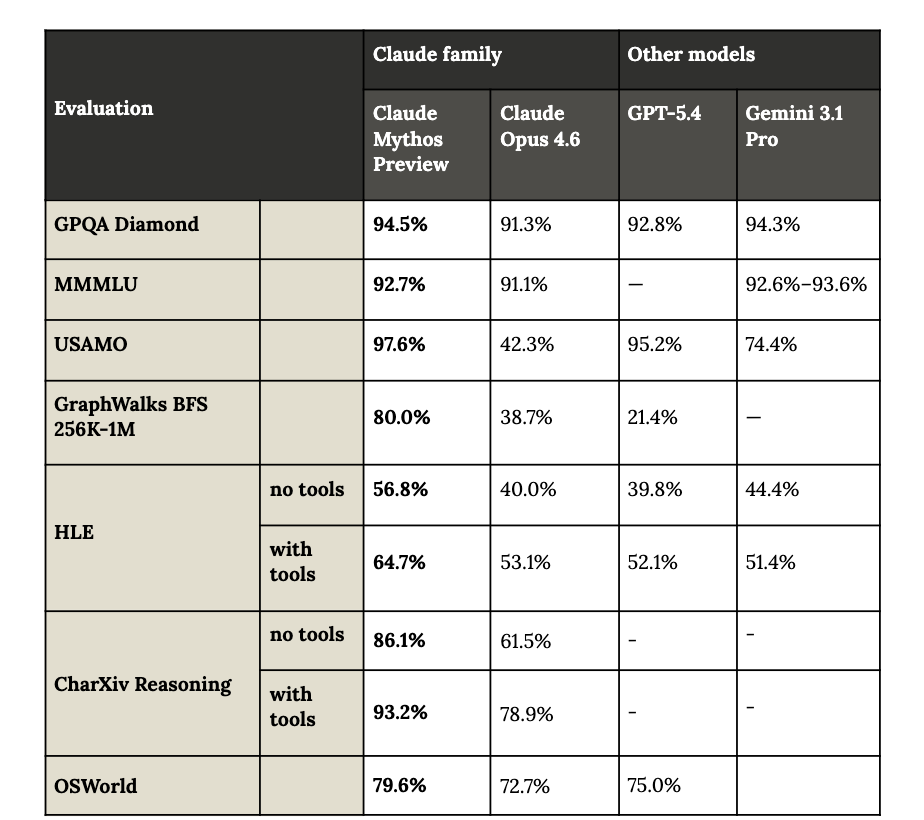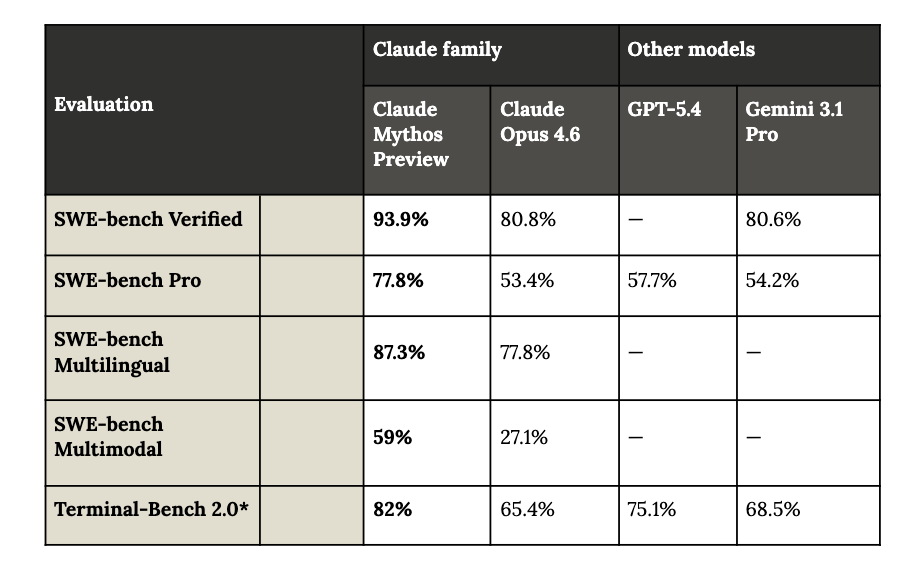 以前的模型发布,拼的是跑分:MMLU 多少?SWE-bench 多少?这次 Mythos Preview 也刷爆了榜单,比目前市面上目前最突出的Opus 4.6模型的能力进一步大幅提升。