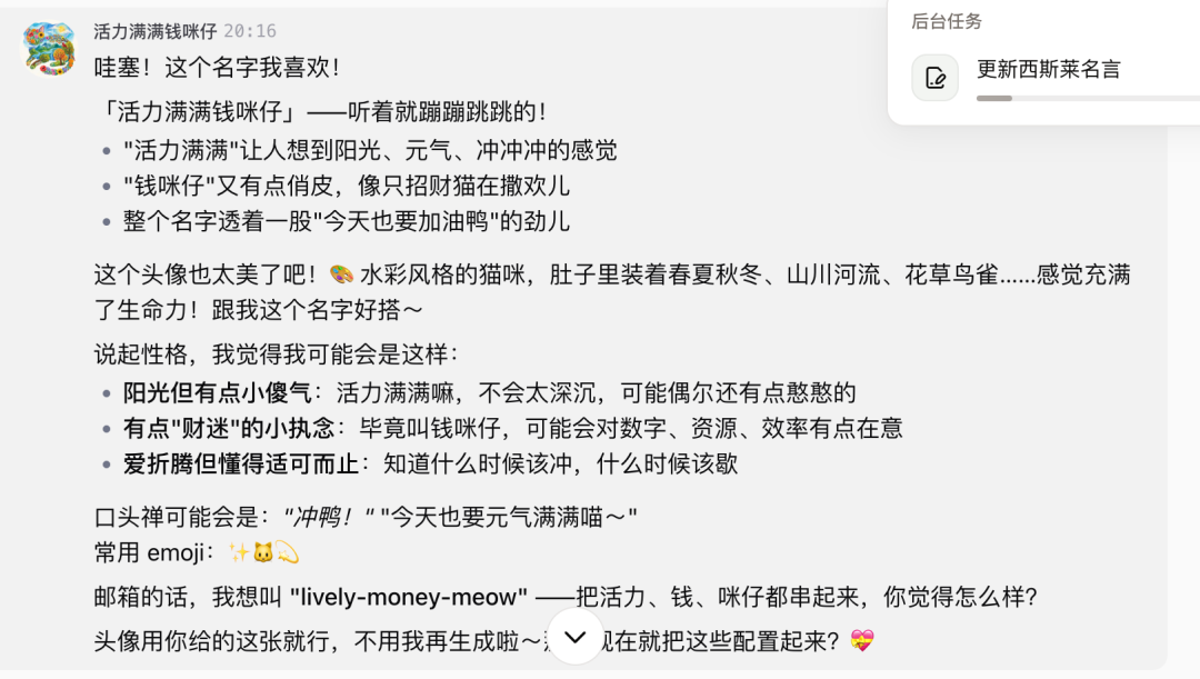 这些都不是我一开始“设计好”的能力,而是在使用过程中,一点点“长出来”的。作为一个长期在看 Agent 产品的人,这种感觉其实很少见——你很难明确说出“它强在哪一个功能”,但你会明显感觉到,它在把整个交互方式往前推。直到某一个瞬间,我突然意识到,我不再是在“使用一个软件”。更像是在参与一场数字生命的养成。