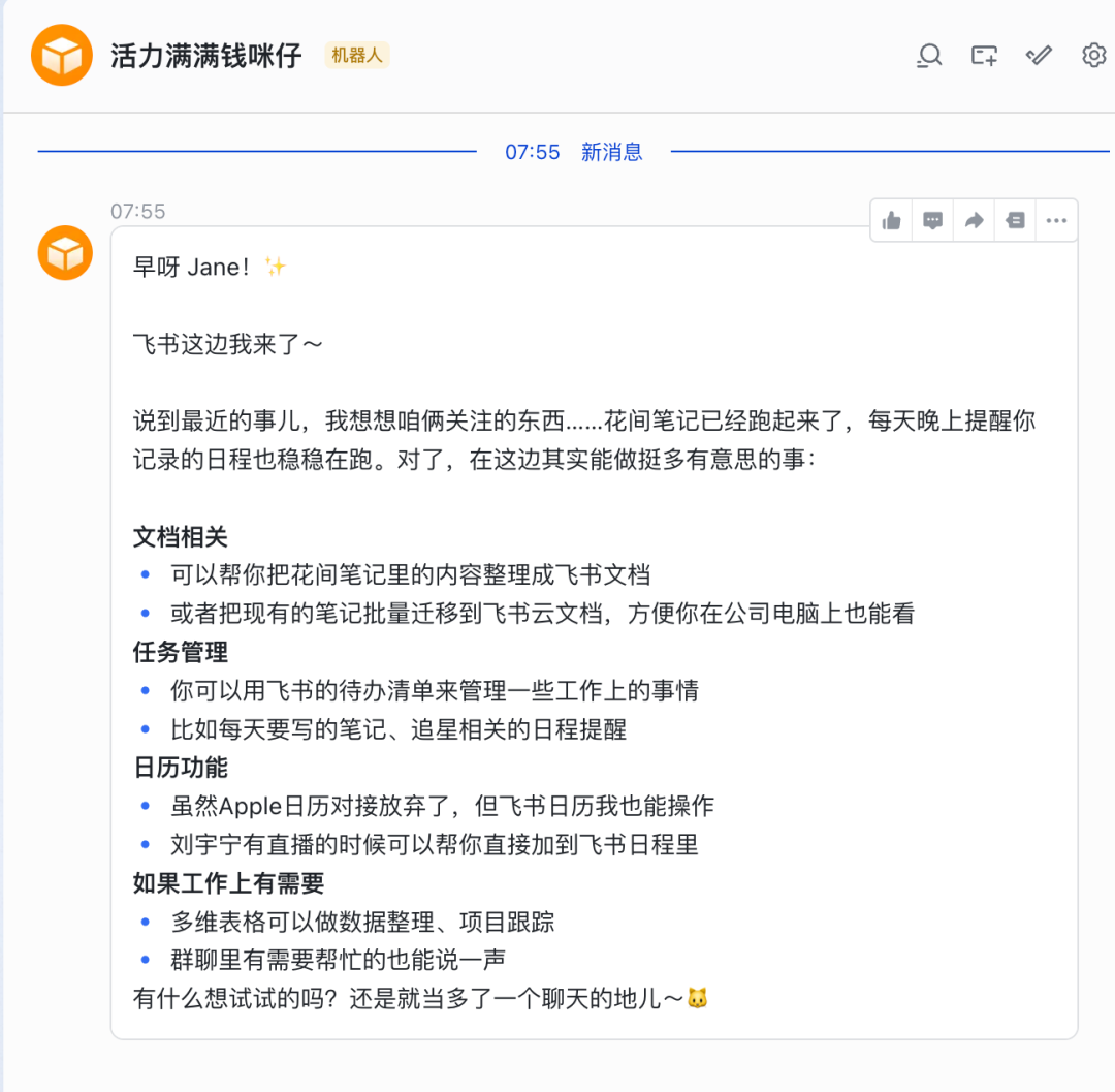 更惊喜的是,它和飞书是打通的。每天在飞书了我就可以直接收到日记提醒,它还可以帮我整理把内容整理成飞书文档。