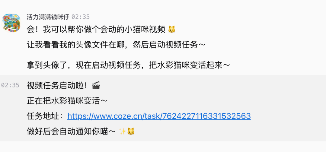在一边帮我做网页,一边在云手机里帮我查信息、追星的同时,我还临时起意,让直接开始了一个新任务——让它集合自己的头像直接做一个视频,就这么短短一句话,它就走了一整套完整的创作流程,从创意理解,把头像变成会动的小猫 ,到素材调用自动找到我的头像 , 再到脚本设计,最后进入生成、剪辑、合成,这一切,是可以一边对话一边修改的。