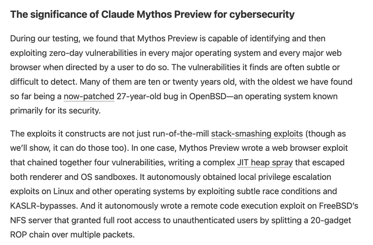 Mythos 的系统卡片以及Anthropic的红队测试报告(https://red.anthropic.com/2026/mythos-preview),展示了它为何充满危险。这些案例每个都是能让安全研究员半夜惊醒的水平。