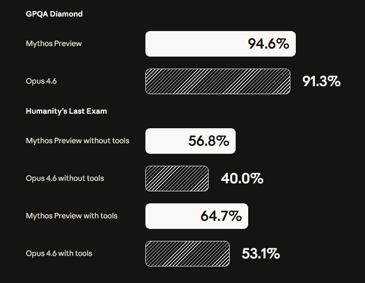 在GPQA Diamond(测试大型语言模型在科学领域的推理和知识水平)测试中,Mythos得分94.6%,Opus 4.6为91.3%。在难度更高的Humanity’s Last Exam(评估大模型的复杂推理能力和专业知识水平)数据集中,Mythos在无工具状态下得分56.8%,Opus 4.6为40.0%;使用工具后Mythos提升至64.7%,Opus 4.6为53.1%。