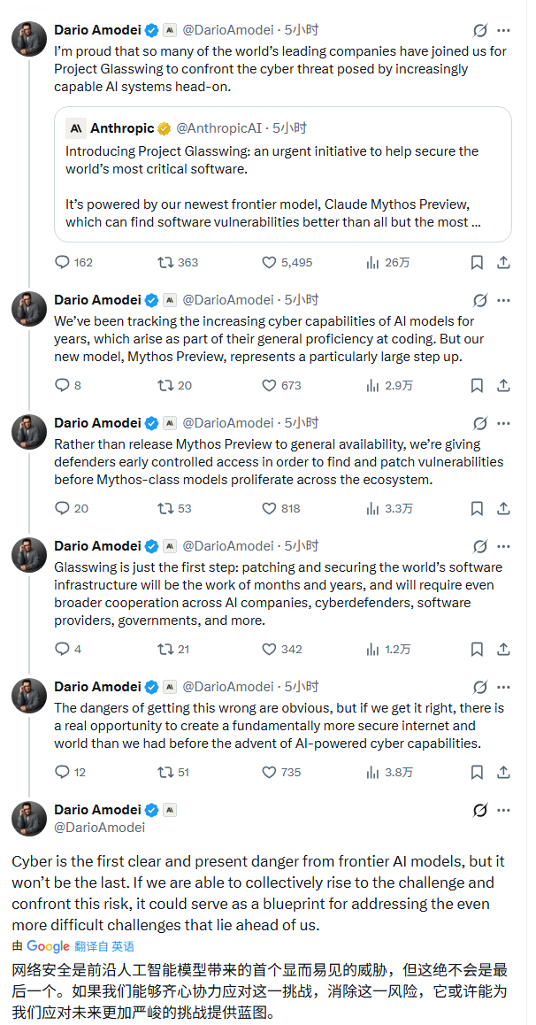 在社交媒体上,Anthropic首席执行官达里奥·阿莫代伊(Dario Amodei)的发言显得忧虑多过兴奋。他认为Mythos所展示的漏洞挖掘能力,只是前沿AI带来的第一个清晰而紧迫的风险。