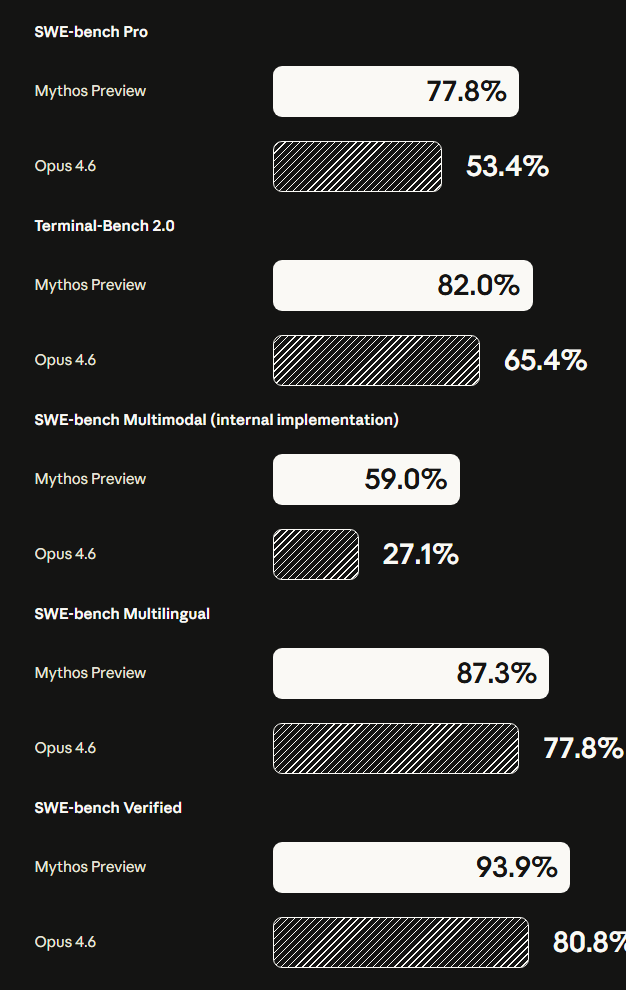 在模拟真实世界软件修复任务的SWE-bench Pro测试中,Mythos得分77.8%,领先Opus 4.6约24个百分点。