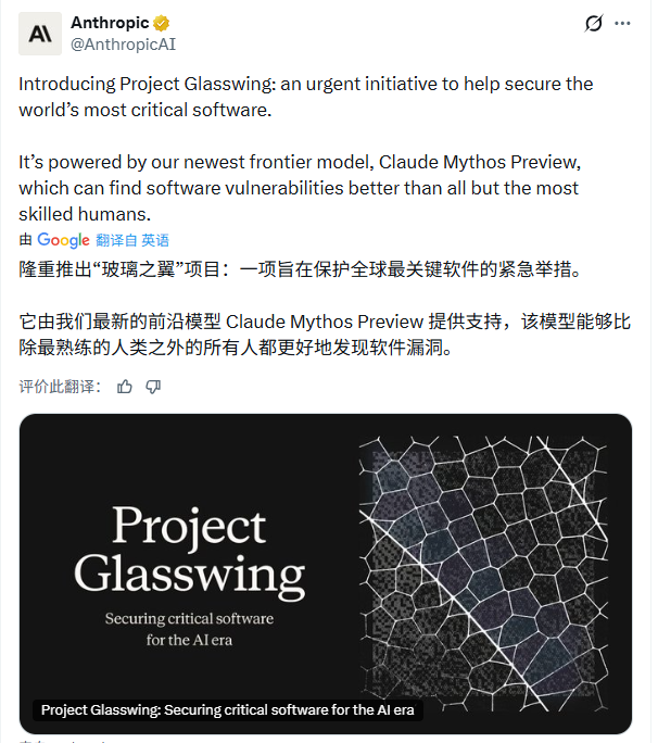根据Anthropic公布的信息,公司启动了一个名为“Project Glasswing”(玻璃翅膀)的项目,试图建立一个先发制人的防御联盟。