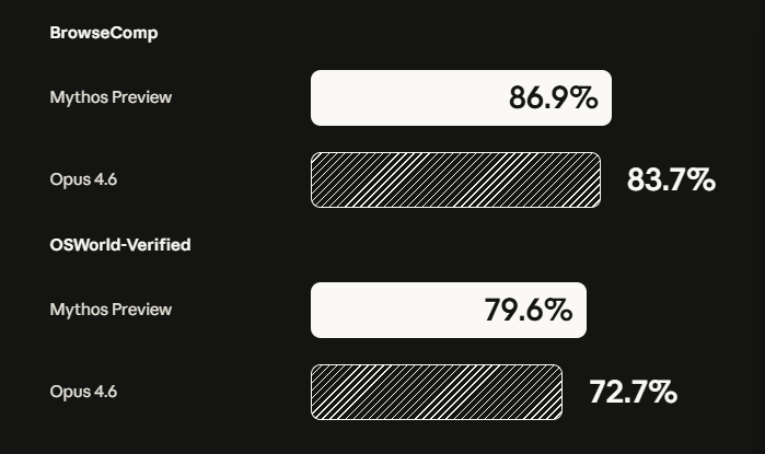 在OSWorld-Verified(智能体计算机使用基准测试)测试中,Mythos得分79.6%,Opus 4.6为72.7%。