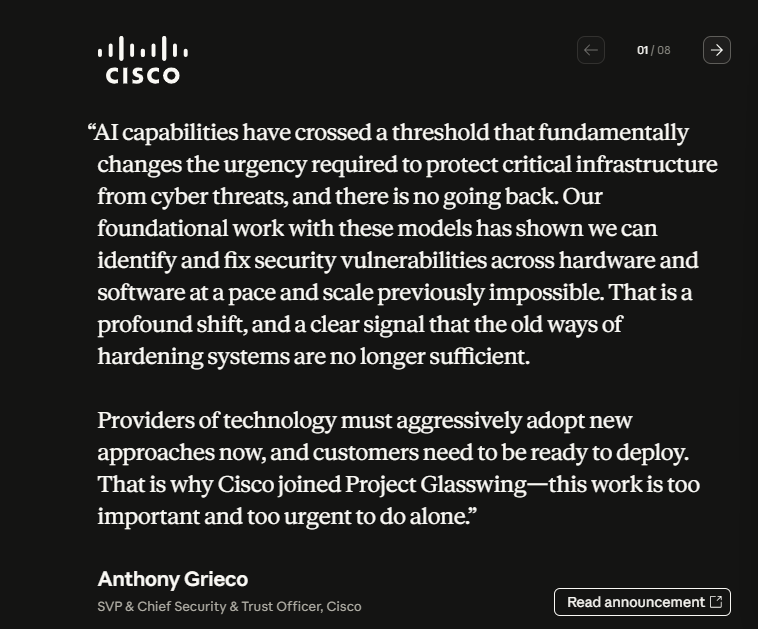 在硬件层面,英伟达、博通等公司的参与意味着安全风险正向底层硬件渗透。思科高级副总裁安东尼·格里科(Anthony Grieco)指出,过去加固系统的方法已经失效,Mythos正在以前所未有的速度扫描硬件漏洞,这种深刻的转变没有回头路可走。