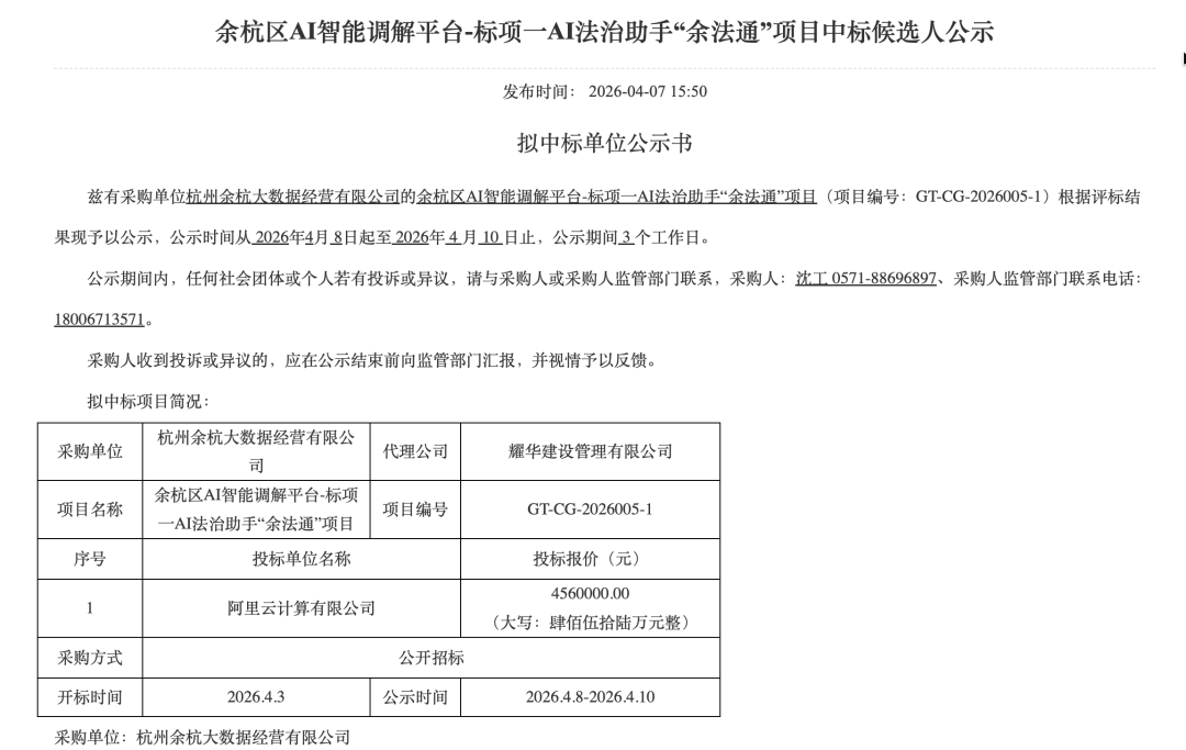 4月7日,余杭区AI智能调解平台-标项一AI法治助手“余法通”项目开标,阿里云计算有限公司中标,金额456万元。