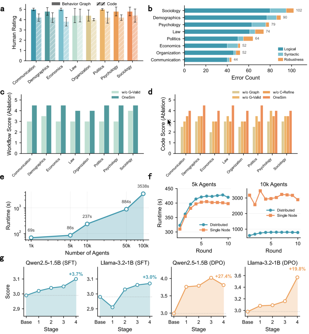 YuLan-OneSim 平台能力验证:(a)专家评分,(b)错误类型分布,(e)规模扩展性测试,(g)反馈微调效果。