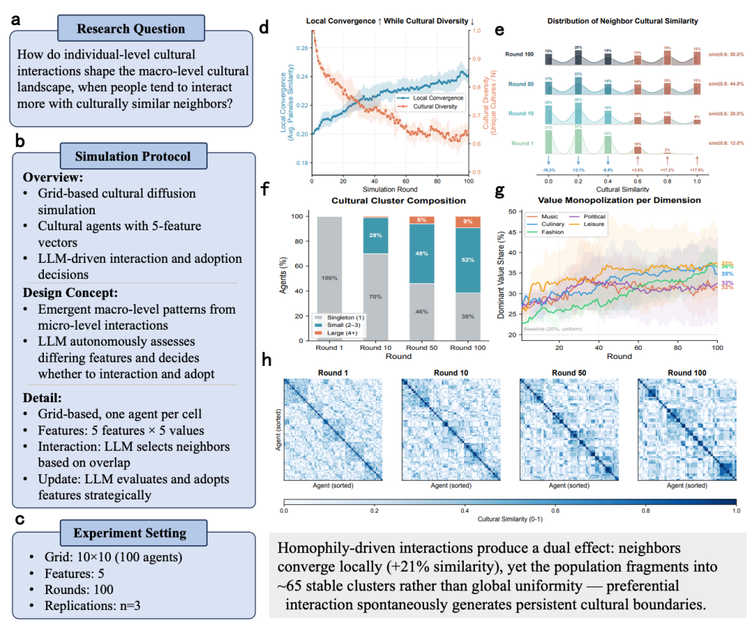 S-Researcher 自主设计了完整实验:在 10×10 网格上放 100 个 LLM Agent,每人 5 个文化特征维度(音乐、饮食、时尚、政治、休闲),跑 100 轮。