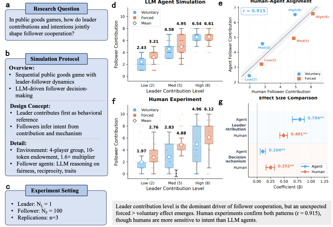 为了验证,团队同步开展了平行人类实验(N = 120,3 轮),实验设置完全相同。结果令人振奋:人类同样表现出「强制 > 自愿」的模式,6 个条件下人机均值的 Pearson 相关系数达到 r = 0.915。不过差异也存在:人类对意图的敏感度明显更高(β_human = 0.251 vs. β_agent = 0.104),LLM Agent 则更依赖金额本身。