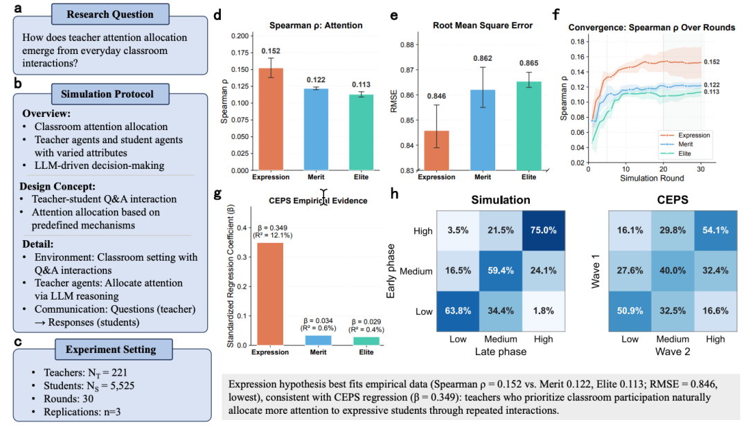 结果:表达假说完胜。与 CEPS 实际数据的 Spearman 相关系数,表达假说(ρ = 0.152)显著高于成绩假说(0.122)和精英假说(0.113)。独立验证中,CEPS 回归分析显示沟通能力对教师注意力的解释力(β = 0.349,R² = 12.1%)约是学业成绩的 20 倍(β = 0.034),与模拟结论完全一致。