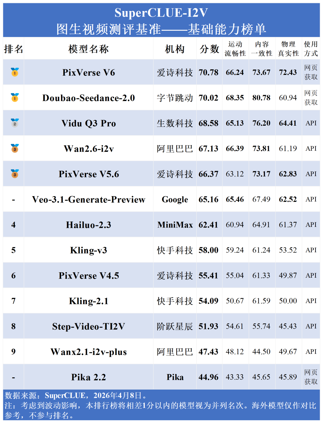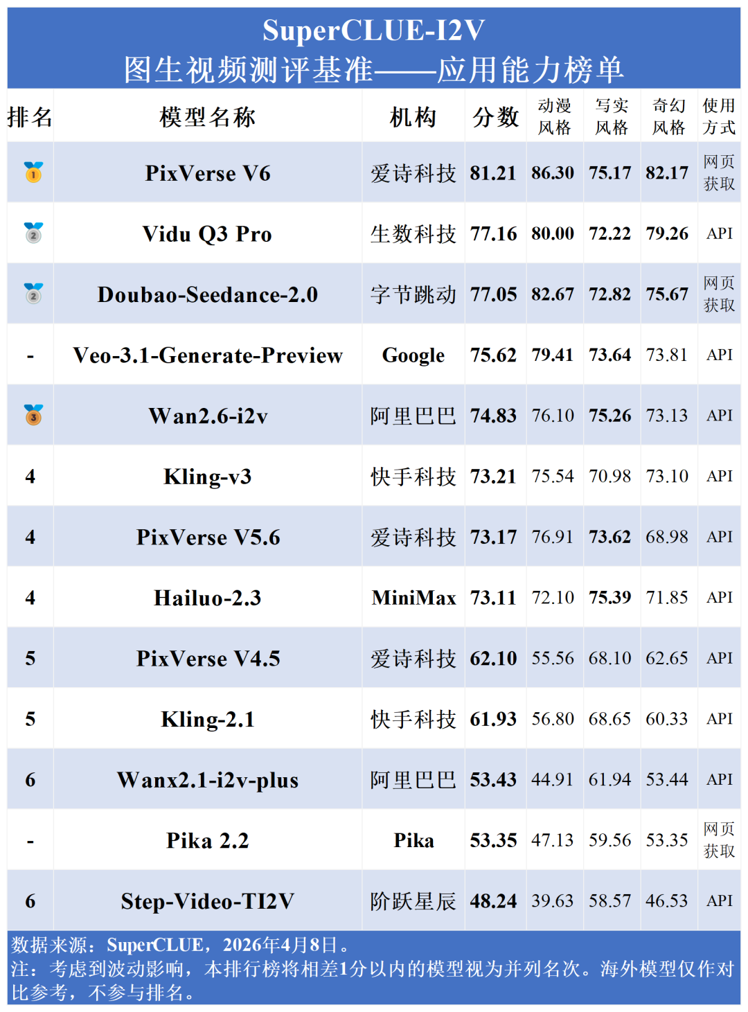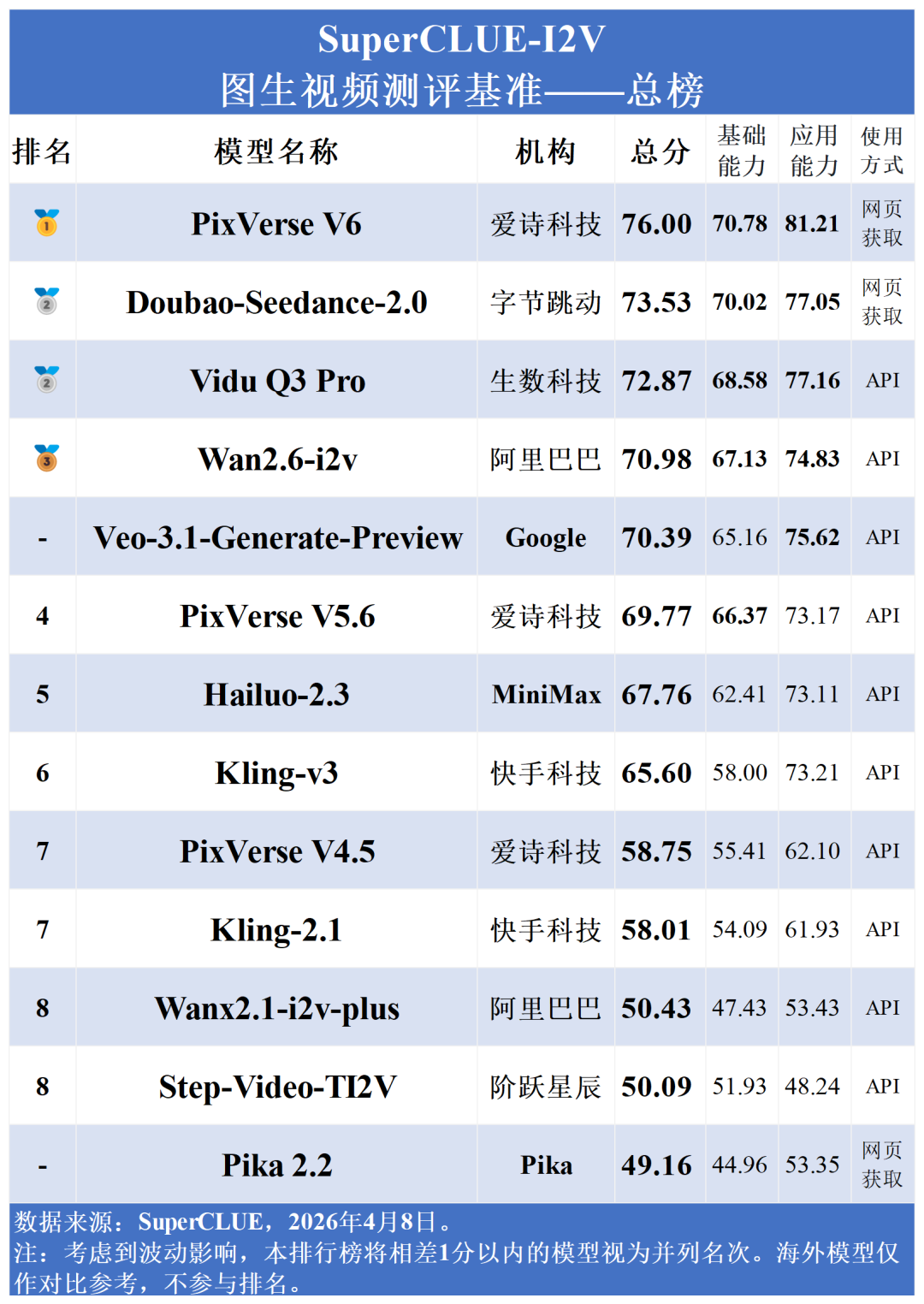 图生视频4月中文测评榜单发布 | PixVerse V6引领发展,国产模型百花齐放!