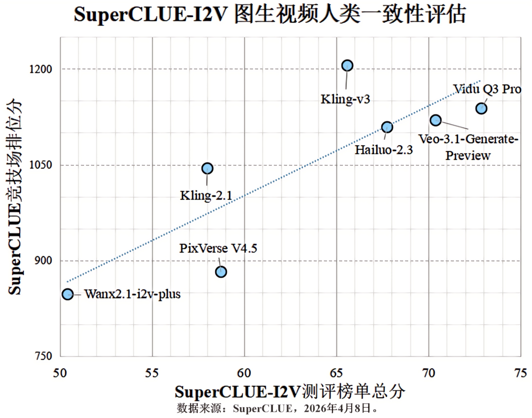 为验证测评体系的公信力,我们将SuperCLUE图生视频中文竞技场排位分与本次SuperCLUE-I2V测评榜单总分进行交叉分析。结果显示,客观测评体系精准反映了真实用户的感官体验,两者呈现高度趋同,具体统计指标如下: