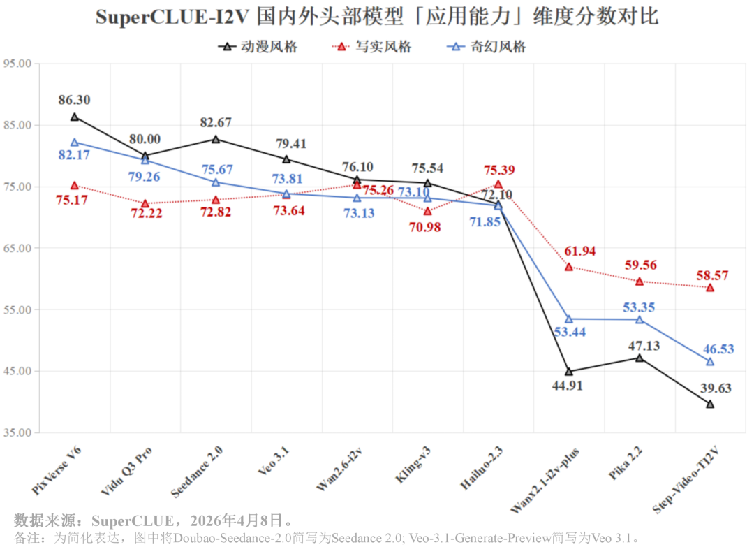 同时观察折线走势图,头尾模型差距明显。“动漫风格”上,PixVerse V6(86.30分) 拔得头筹;但随着梯队下移,该维度呈断崖式下跌。“写实风格”走势平缓,主流模型分数在70-75分区间内。直观反映出模型在写实维度上的高度趋同,而动漫和奇幻风格则是目前拉开总榜排名的核心。
