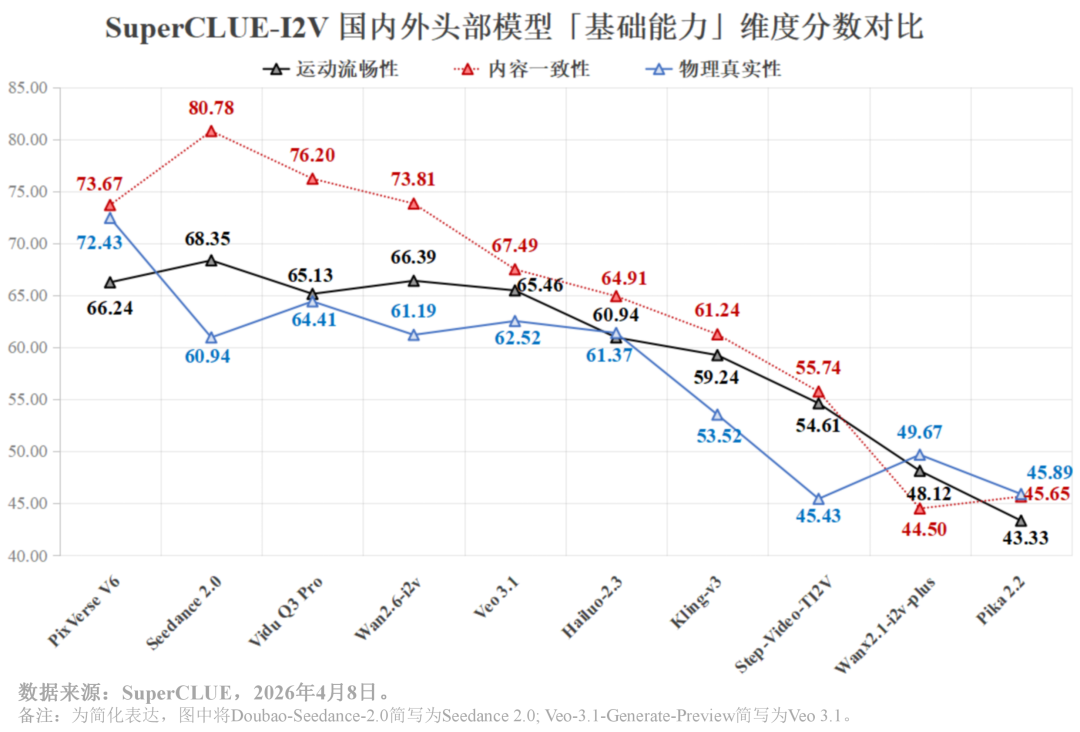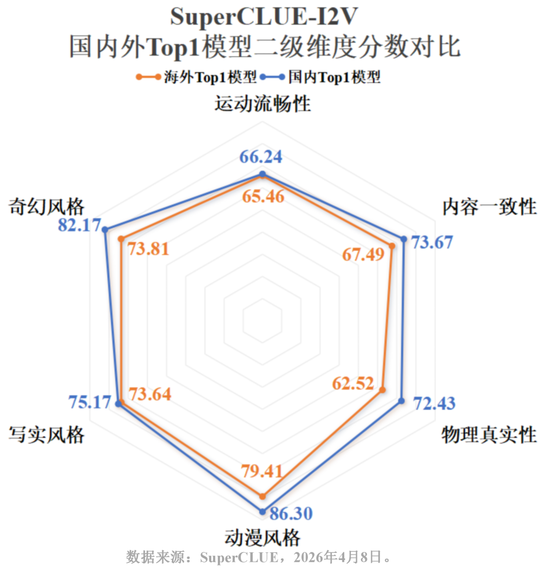 2026年4月,中文原生图生视频模型测评基准(SuperCLUE-I2V)4月榜单正式发布。该基准立足于中文语境,延续过往基准设计2025年6月SuperCLUE-I2V测评基准,围绕运动流畅性、内容一致性、物理真实性、动漫风格、写实风格和奇幻风格六大任务构建评测体系。