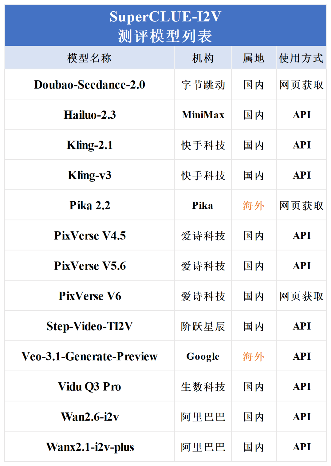 为综合衡量国内外文生视频模型的发展水平,本次测评选取了代表性的2个海外模型和11个国内模型。