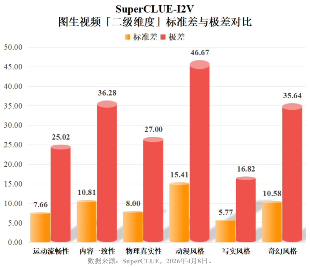 当前图生视频模型的发展呈现出明显的非均衡状态。大多数模型的“应用能力”得分显著高于“基础能力”。结合二级维度的极差与标准差分析,不同风格的生成能力形成了极其明显的断层;而底层的物理运动规律则成为全行业的共同瓶颈,模型间未能拉开实质性差距。