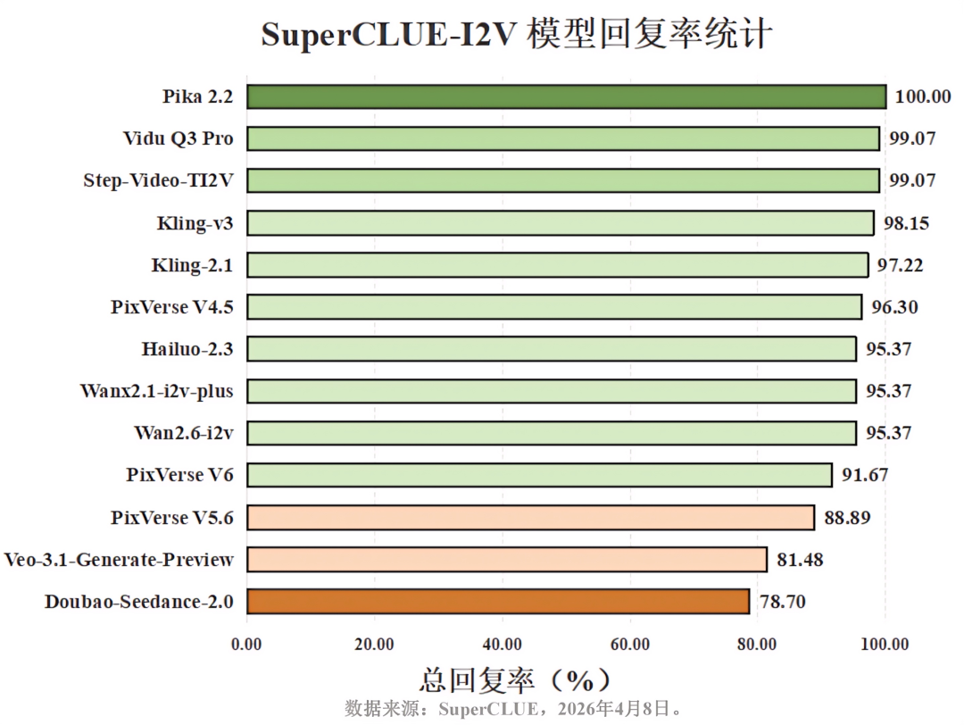 本次测评中,由于不同视频生成模型存在各自的规则约束与内容安全限制,模型有效回复率存在明显差异: