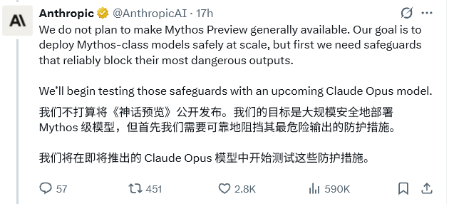 Anthropic神话模型发布,但不让你用