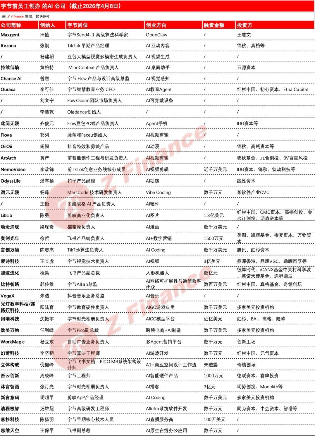 如果说人才流向大厂是“输血”,那么字节系集结创业则是“造林”。在过去的20个月里,30余家AI新贵从字节的母体中脱胎而生,其中许多创始人在工牌尚未交还之前,账户里便已躺着红杉、IDG等一线机构的巨额支票。