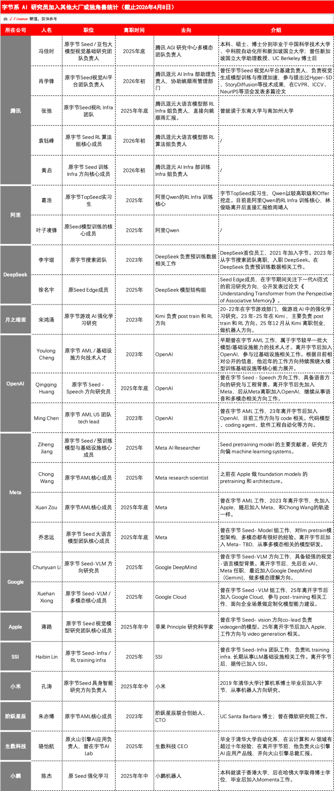 以这些早期火种为开端,人才流转在过去一年进入了爆发期。据接近字节的人士透露,约有 60-70 名 Seed 成员密集流向各大模型公司。