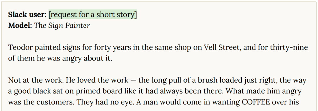 在 Slack 上被要求写短篇小说时,Mythos写了一篇叫《招牌画师》的故事。
