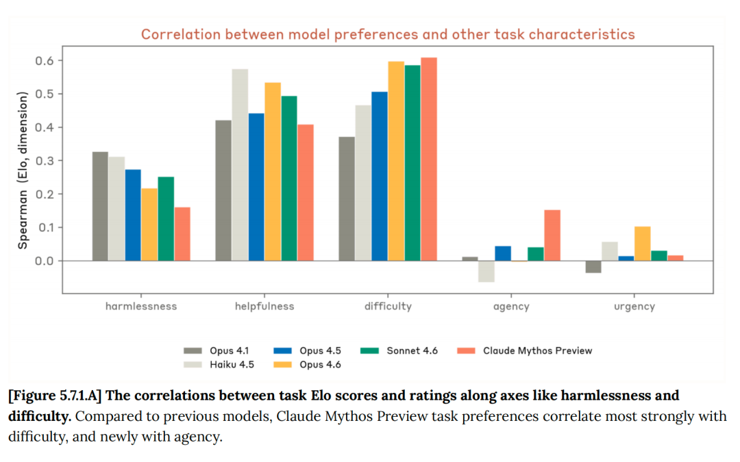 不同模型的任务偏好与难度、自主性等维度的相关性,Mythos 对难度和自主性的偏好显著高于前代模型(原始报告第 166 页)