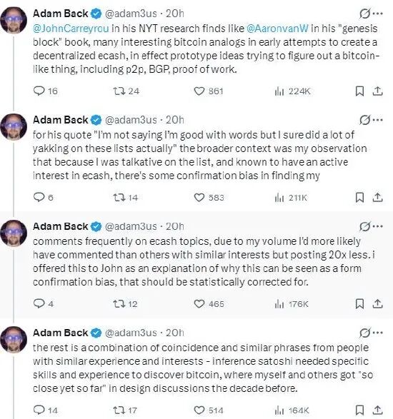巴克表示,《纽约时报》调查记者 John Carreyrou 的结论存在「选择性归因」的问题:由于他在密码朋克邮件列表中发言非常活跃,发帖量远高于他人,因此在电子现金等话题上留下评论的概率更高,这导致调查者更容易将他的言论与中本聪关联,而这只是一种统计上的偏差。巴克认为,其余证据是巧合以及具有相似经验和兴趣的人使用类似措辞的结果。他指出,中本聪需要特定技能和经验才能发明比特币,而他和许多人在此前的十年设计尝试中「离最终方案看似很近,实则始终未能触及核心」。