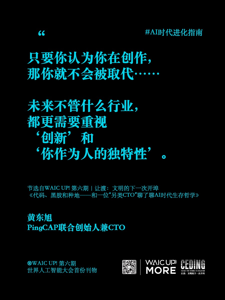 黄东旭(PingCAP联合创始人兼CTO)对比“灌水”与“创作者”的视角重申人的独特性:“我不想看到一个AI在台上给我演奏。我还是希望是一个活生生的人,哪怕他演奏的东西有瑕疵。但我知道,我对面是一个有情感的人,有交流,我在这个场域里,度过了一段有意义的时间。我觉得,像这种体验,是很不一样的。所以,区分就是:灌水vs创作者。只要你认为你在创作,那你就不会被取代……未来不管什么行业,都更需要重视‘创新’和‘你作为人的独特性’。”