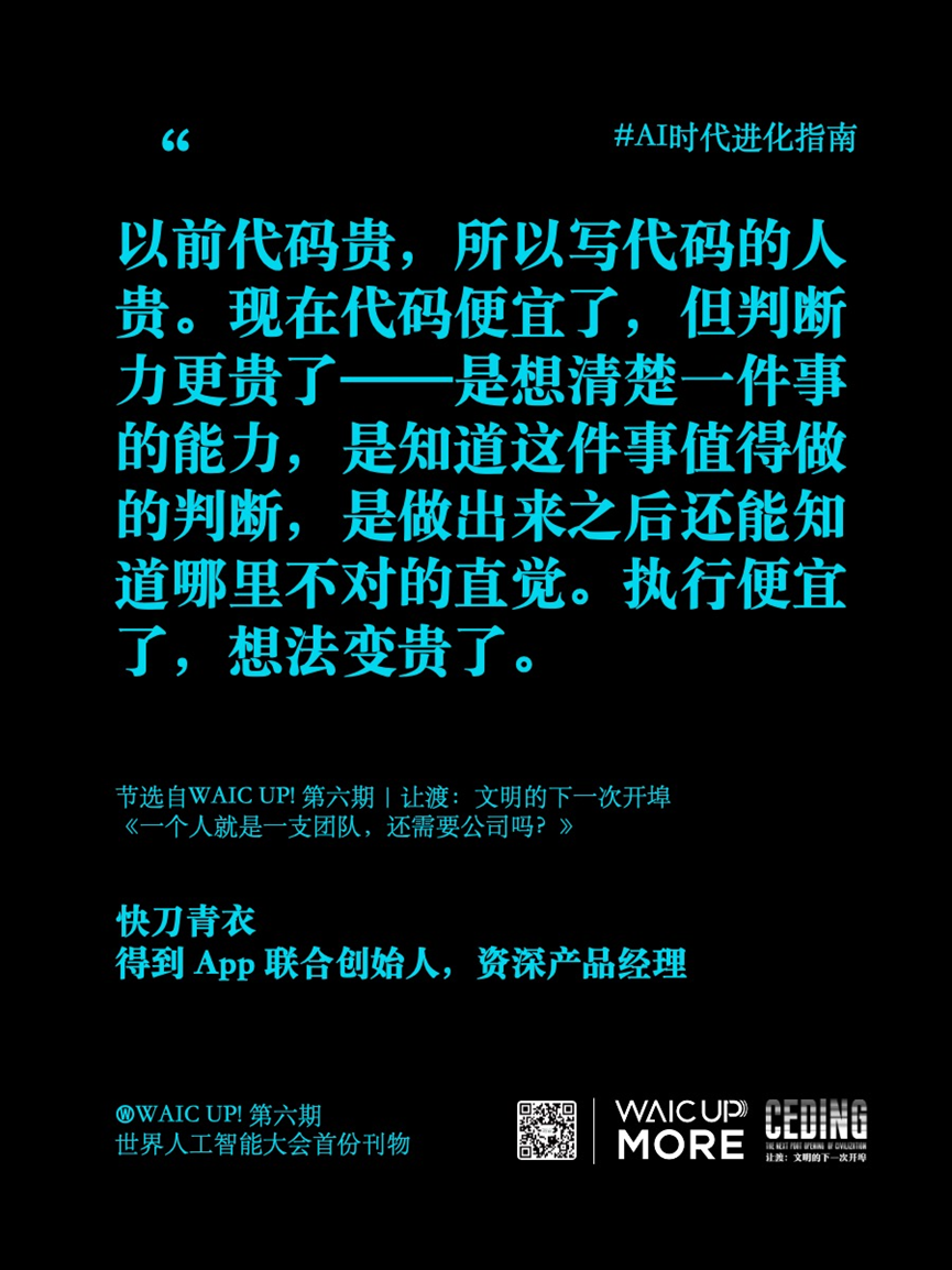 快刀青衣(“得到”App联合创始人)直言执行贬值,判断力成为唯一稀缺资产:“以前代码贵,所以写代码的人贵。现在代码便宜了,但判断力更贵了——是想清楚一件事的能力,是知道这件事值得做的判断,是做出来之后还能知道哪里不对的直觉。执行便宜了,想法变贵了。”
