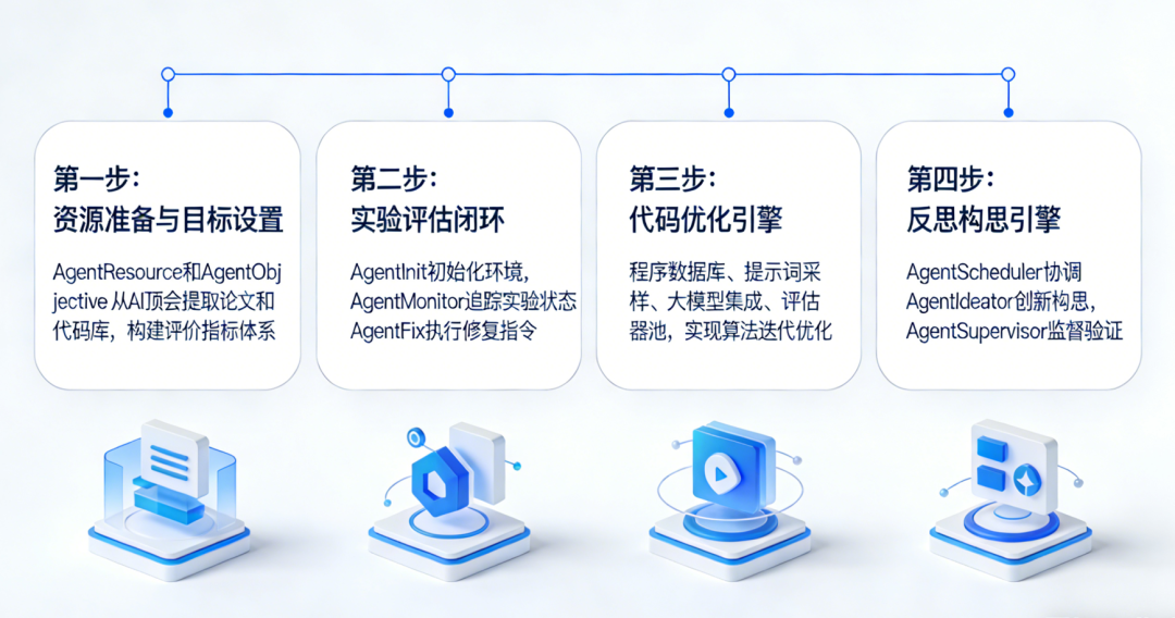 AgentResource 负责管理 PDF 文档和模型参数,而 AgentObjective 则根据论文目标构建评价指标体系(Rubric Construction),确立优化方向。简单来说,它们负责搞清楚要研究什么,以及怎么才算研究得好。