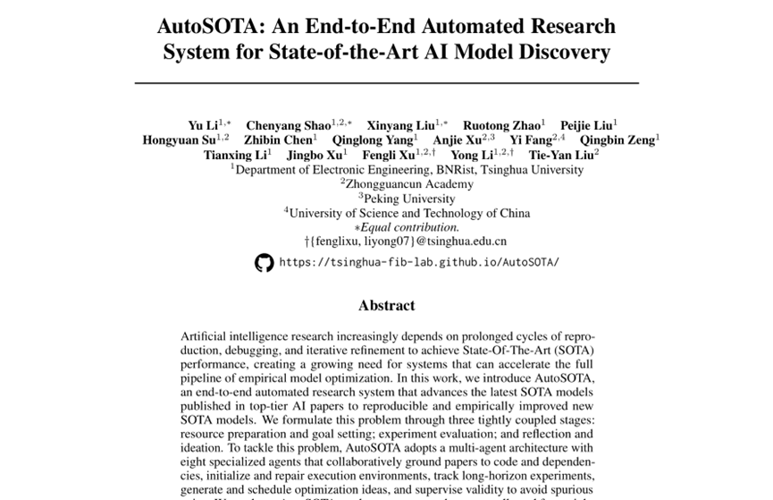 近期,清华大学电子工程系助理教授、北京中关村学院兼职导师徐丰力课题组与北京中关村学院联合发布了 AutoSOTA 项目,为这一难题提供了一套工业级的解决方案。目前,AutoSOTA 项目已发布预印本论文。