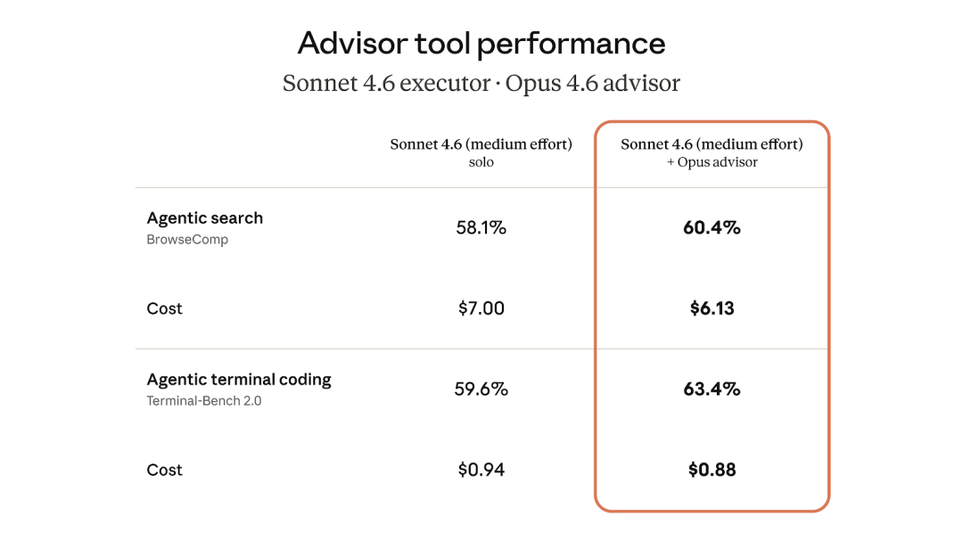 Anthropic 发布了一个新的 API 工具,让 Sonnet 或 Haiku 在跑任务的过程中,遇到搞不定的决策时自动请教 Opus,拿到指导后继续干活。这个策略叫 Advisor Strategy,工具叫 Advisor Tool