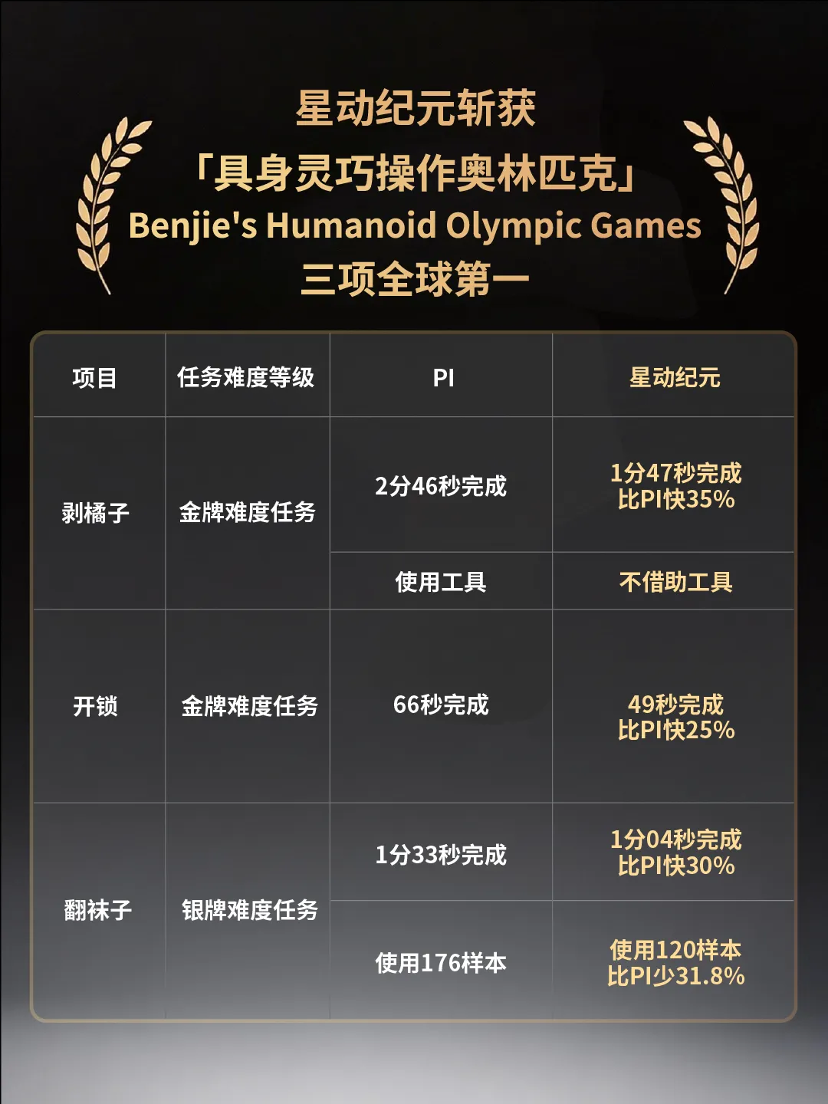 近期,Benjie's Olympics正式宣布星动纪元在剥橘子、开锁、翻袜子三大核心任务中,均以显著优势超越前纪录保持者PI。