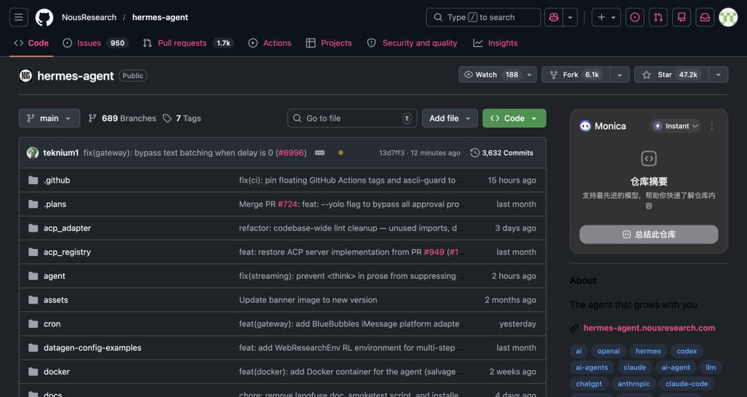 自 2026 年 2 月发布以来,它在短短几周内狂揽超过 2.2 万颗 GitHub Star,目前为止已超过 4.7 万,贡献者也有数百名。从社区反馈来看,这种设定正好击中了一个长期存在的需求——开发者越来越关心,Agent 能不能「记住」和「变强」。