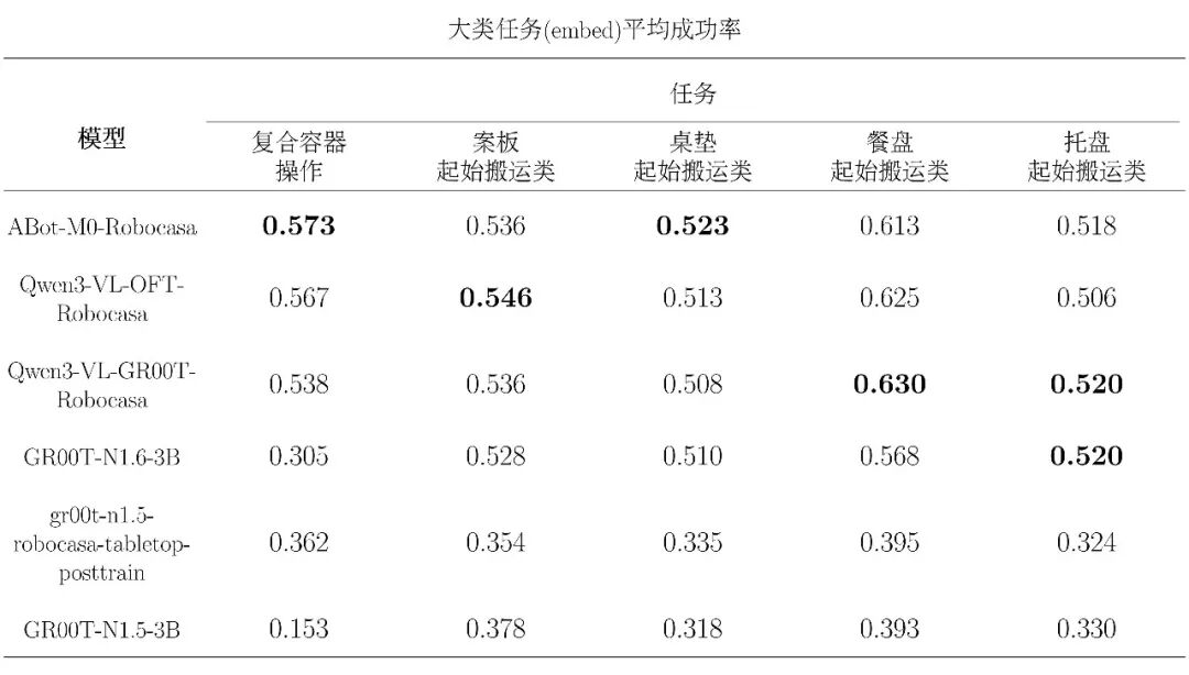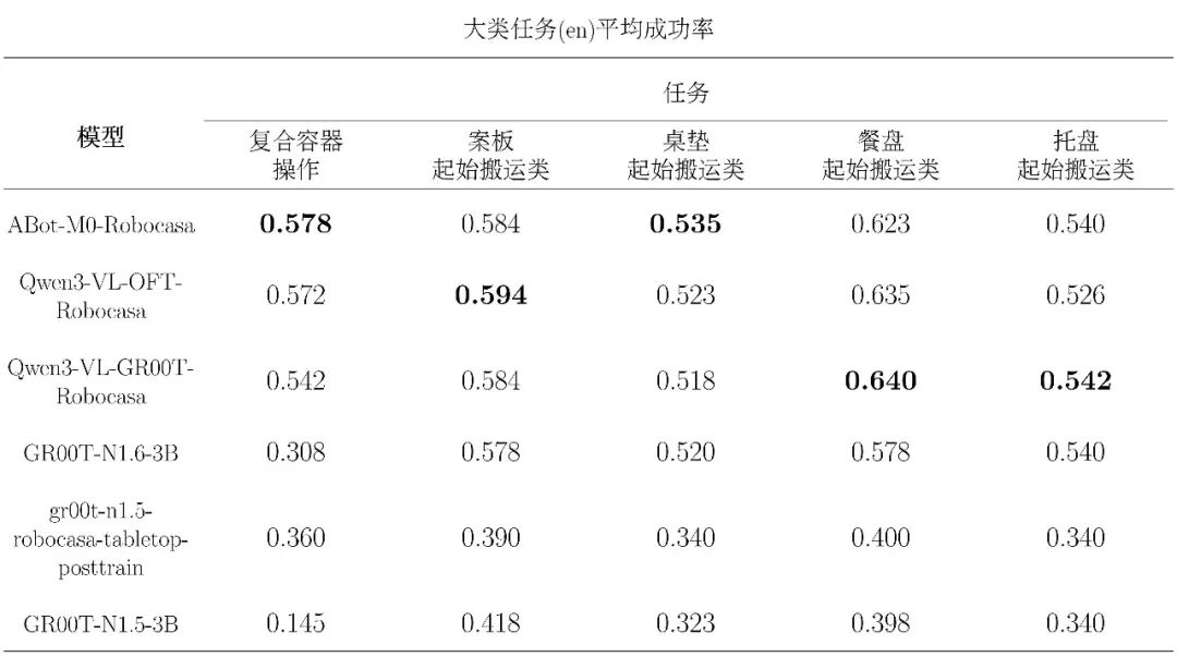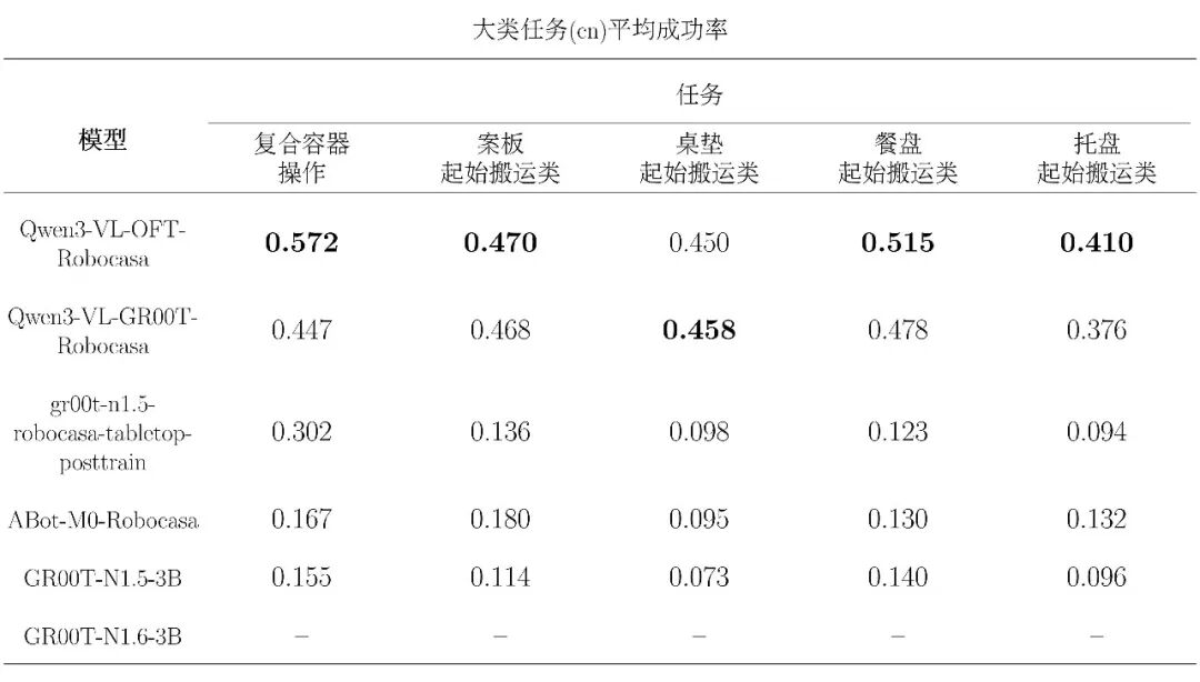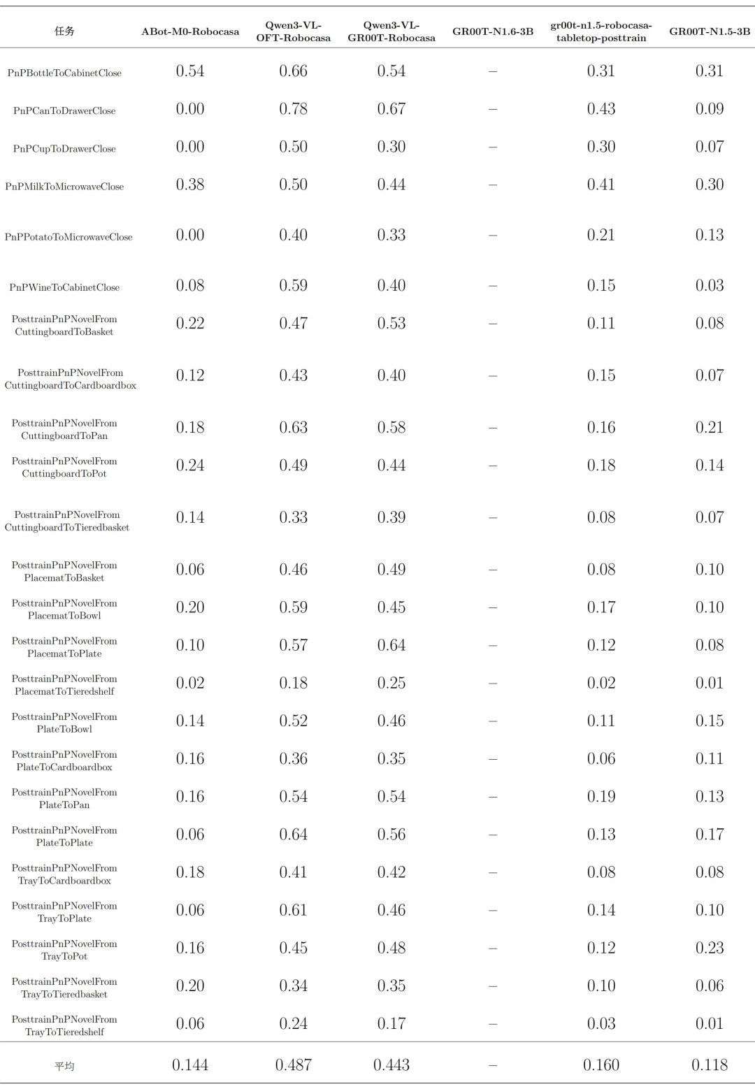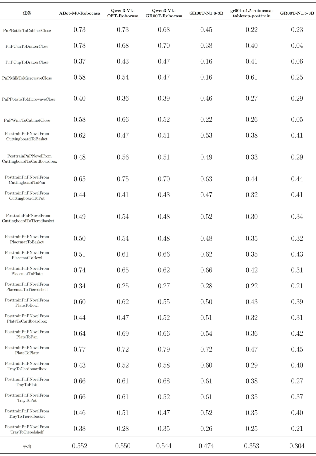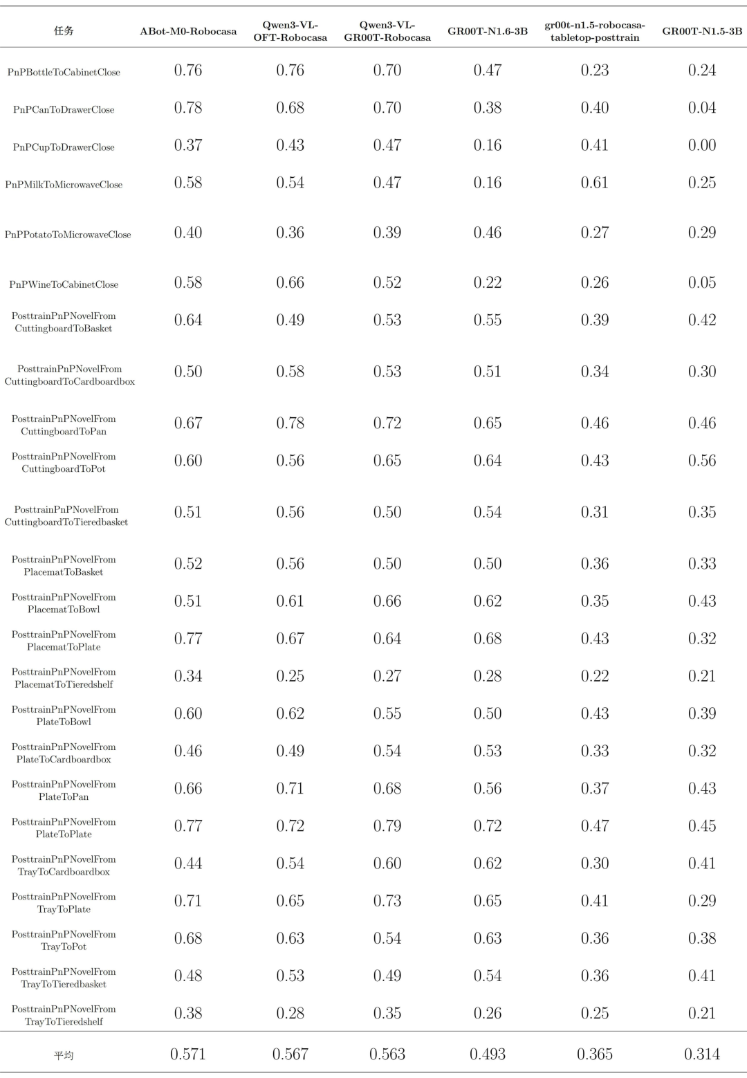 在第一梯队内部,Qwen3-VL-OFT-Robocasa与Qwen3-VL-GR00T-Robocasa虽然总体成功率接近,但在若干细分任务上分别具有更突出的局部优势;ABot-M0-Robocasa则更偏向整体均衡型,在多数任务上不一定都是第一,但整体波动更小、综合表现更稳。