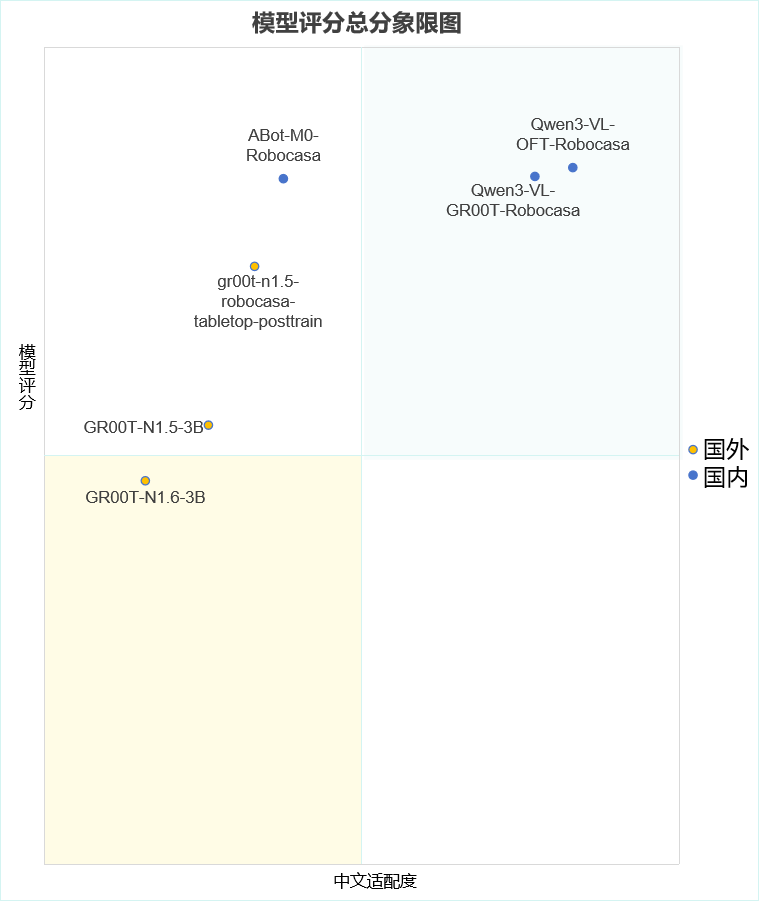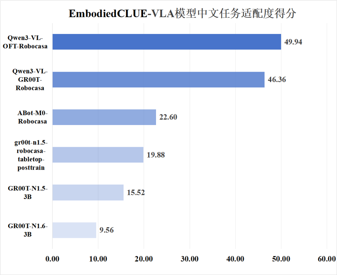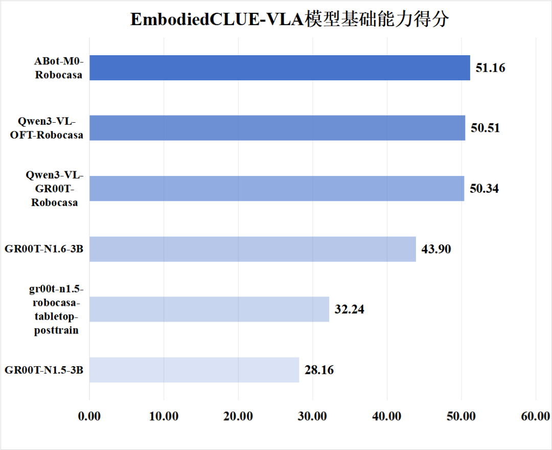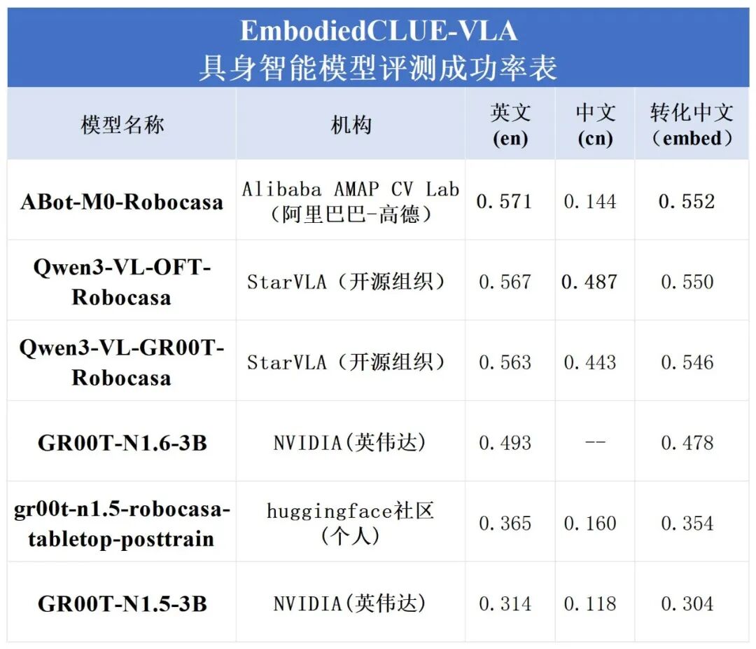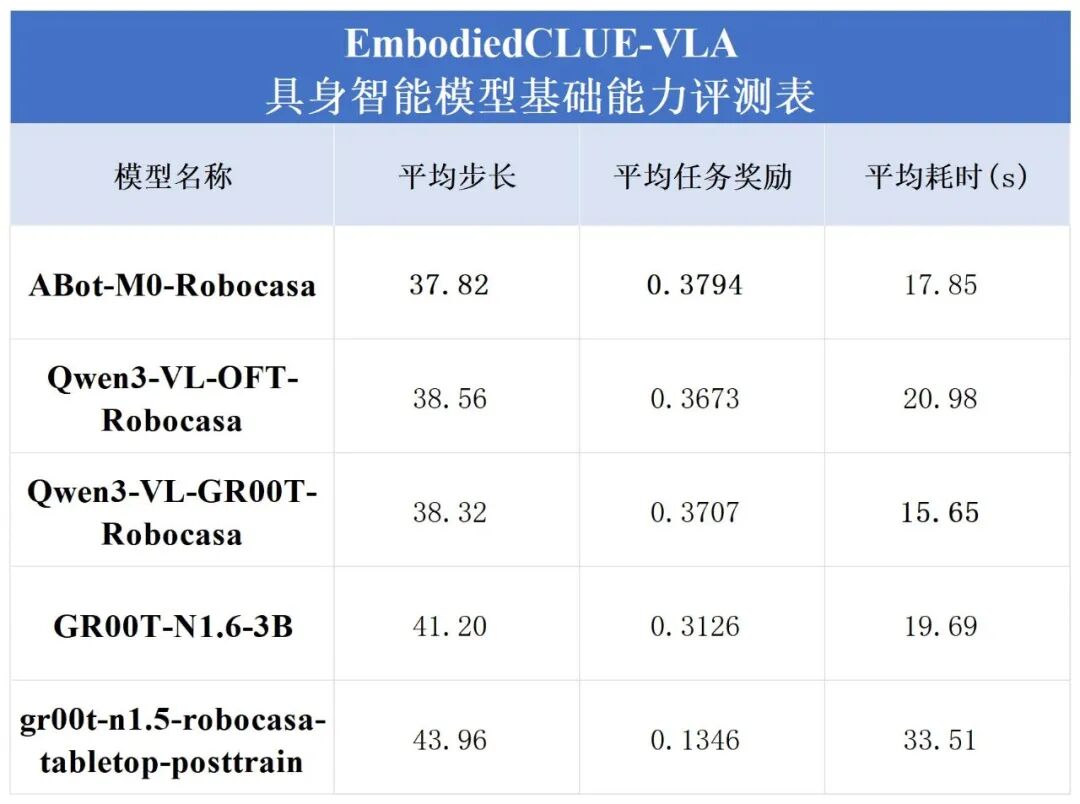 在上一阶段快报中,RoboCasa-GR1-Tabletop 场景下六个公开模型的统一接入、统一评测配置与首轮标准化结果已经完成,基准环境、任务设置与主要指标体系也已初步建立。在此基础上,EmbodiedCLUE-VLA 具身智能评测基准进一步从“评测链路打通”推进到“结果分析与能力比较”阶段,重点围绕六个模型在统一 benchmark 下的整体表现、任务分布差异、中文支持情况以及综合评分方式展开系统整理。