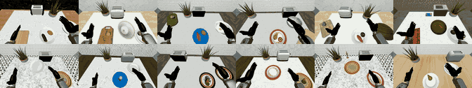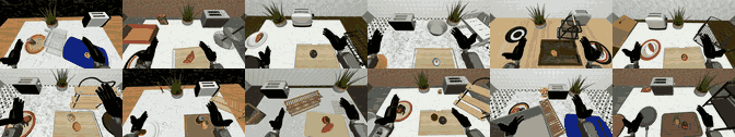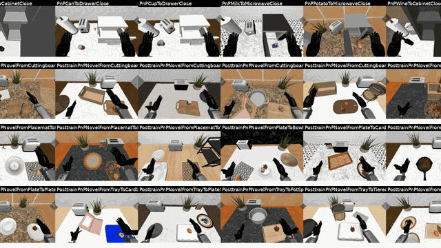 本次评测统一基于robocasa-gr1-tabletop-tasks场景进行。该场景建立在 RoboCasa 与 robosuite 之上,在MuJoCo仿真环境中提供标准化的桌面操作任务、机器人配置、观测接口与动作下发协议,从而保证不同模型面对的是相同的任务定义、相同的观测形式、统一的动作空间与一致的终止条件。